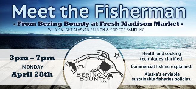 Today only (April 28th), come by Fresh Madison Market and meet the fisherman from Bering Bounty who catch the fresh fish you find here! There will be free samples of wild-caught Alaskan Salmon as well as cod. They will also discuss different cooking techniques and how they help with sustainable fishing issues in Alaska. The event is from 3pm to 7pm Monday April 28th. See you there!